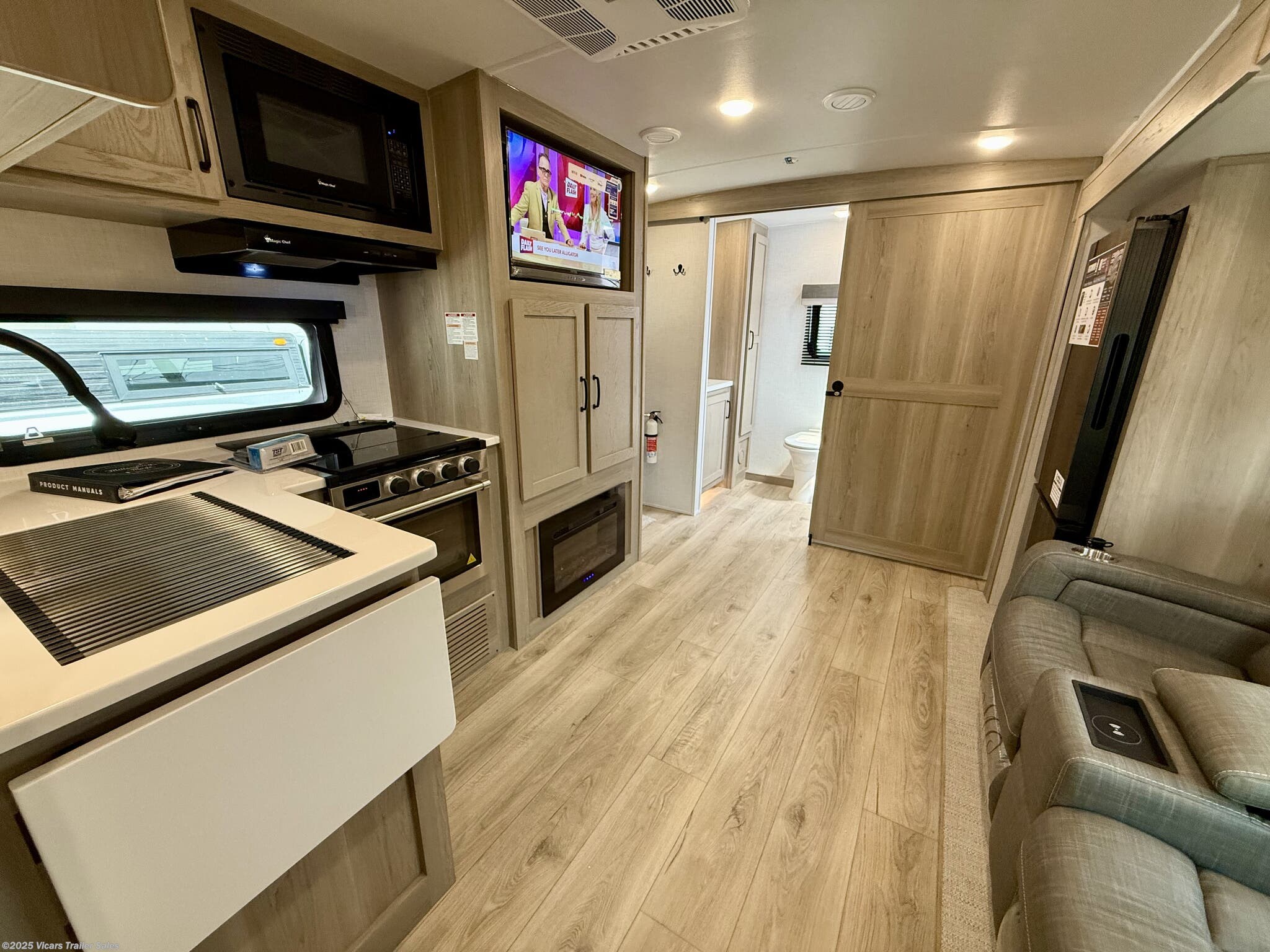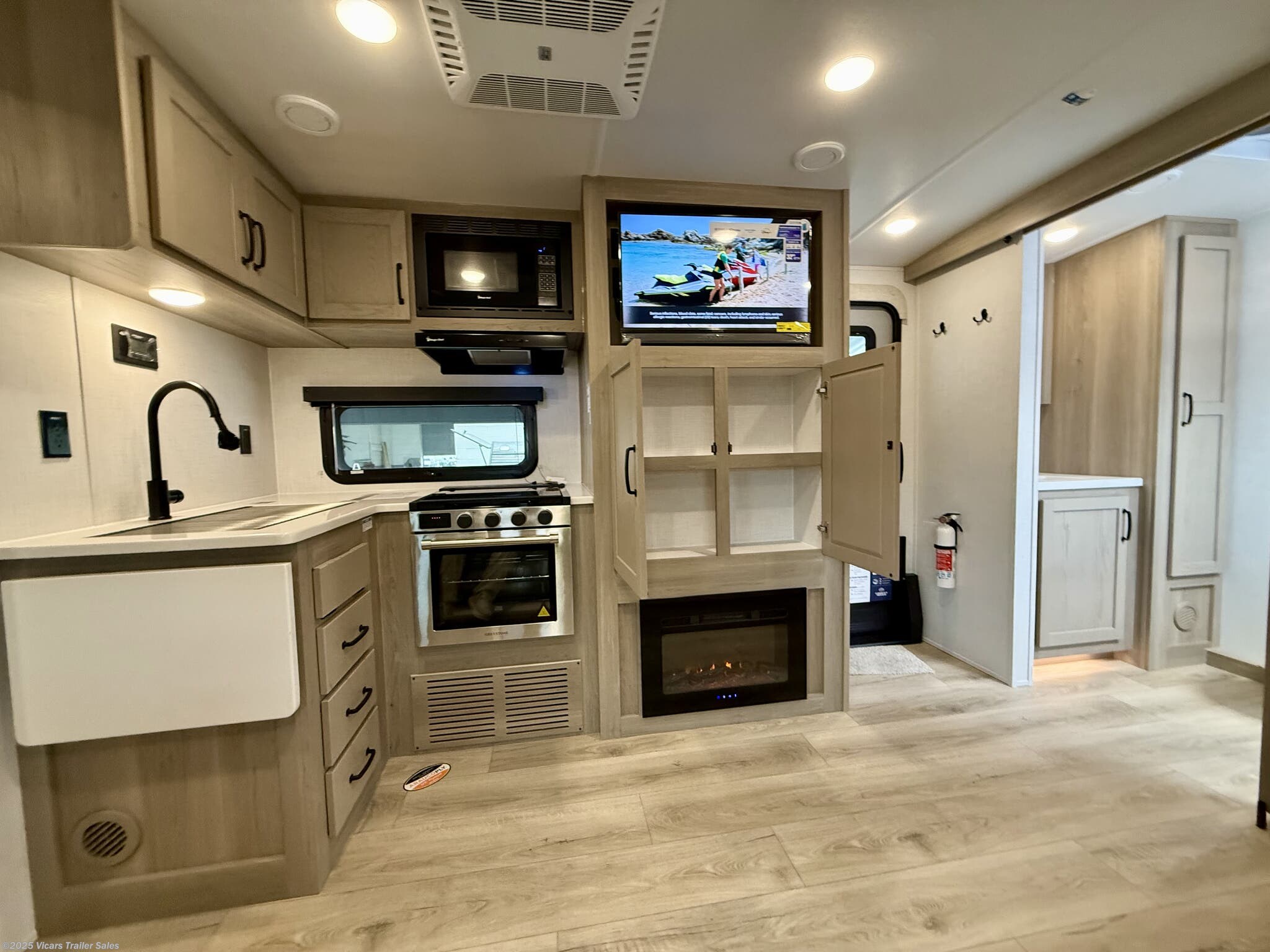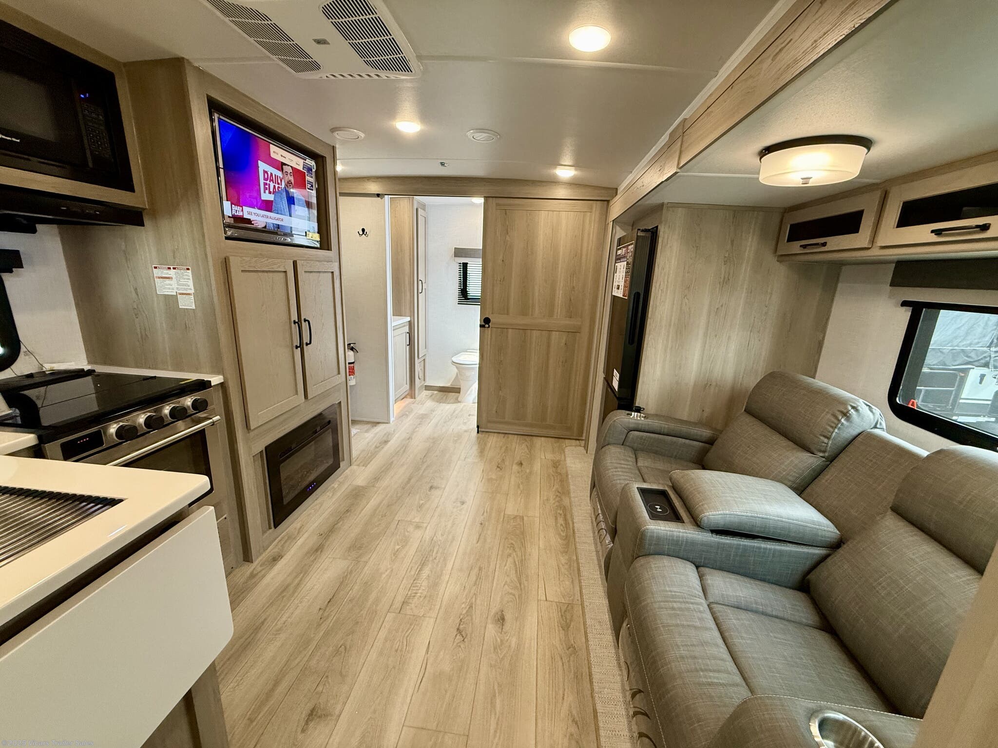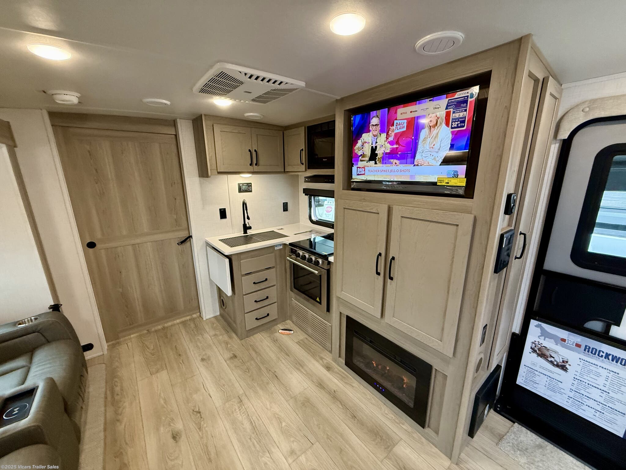 This travel trailer boasts a comprehensive list of features aimed at maximizing comfort and convenience. It is equipped with a furnace, air conditioning (15000 BTU), microwave, oven, refrigerator, and stove with a stovetop burner, ensuring you can prepare meals comfortably whether in hot or cold weather. A water heater, exterior grill, and external shower add to its outdoor living capabilities. Inside, you'll find a cozy fireplace, queen-sized bed, and ergonomic rocker recliners for ultimate relaxation. Additionally, the RV includes modern entertainment options such as a surround sound system, TV, and TV antenna.