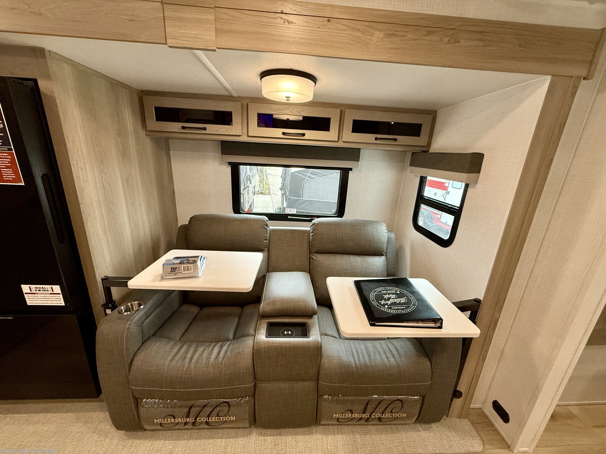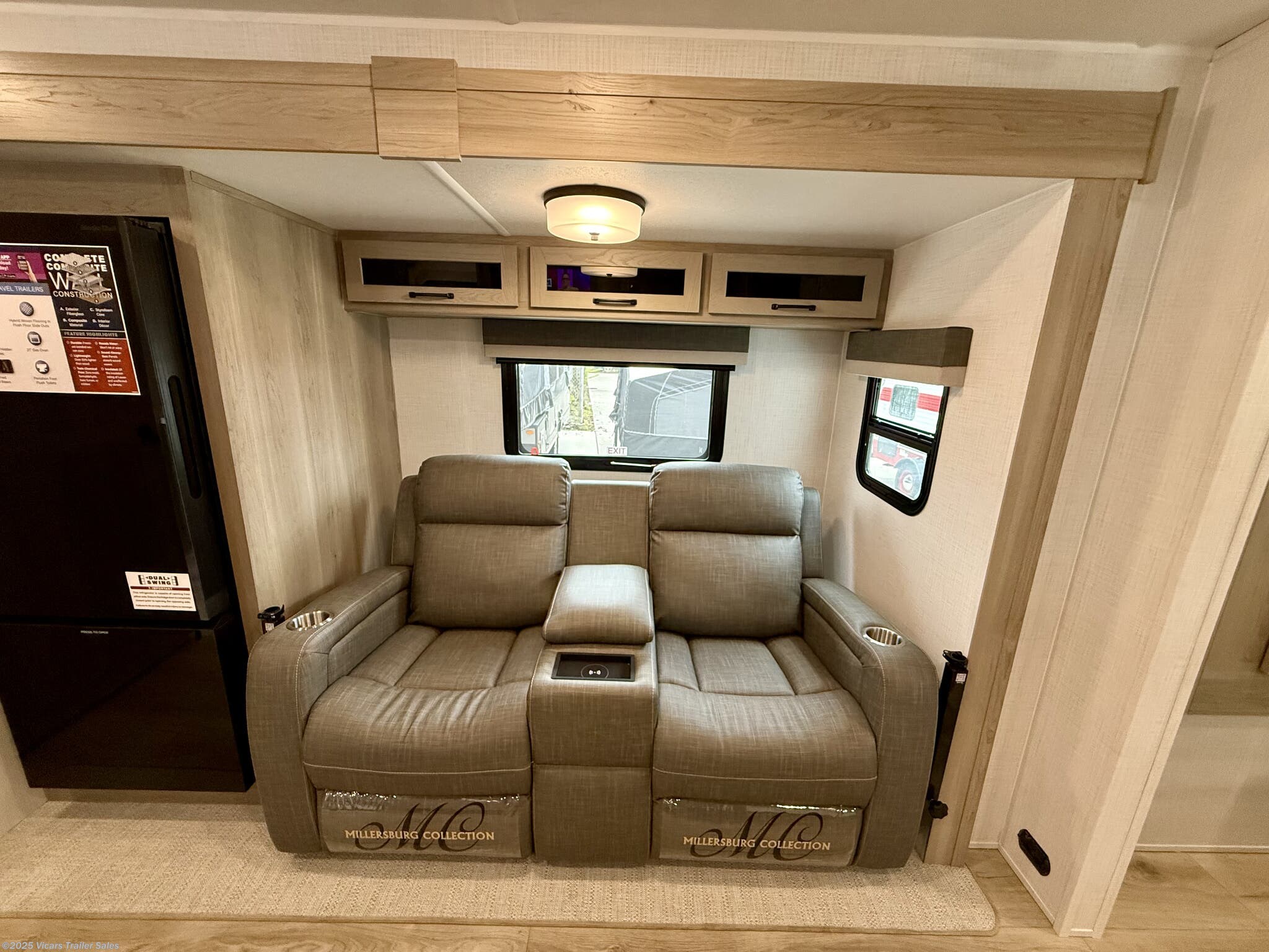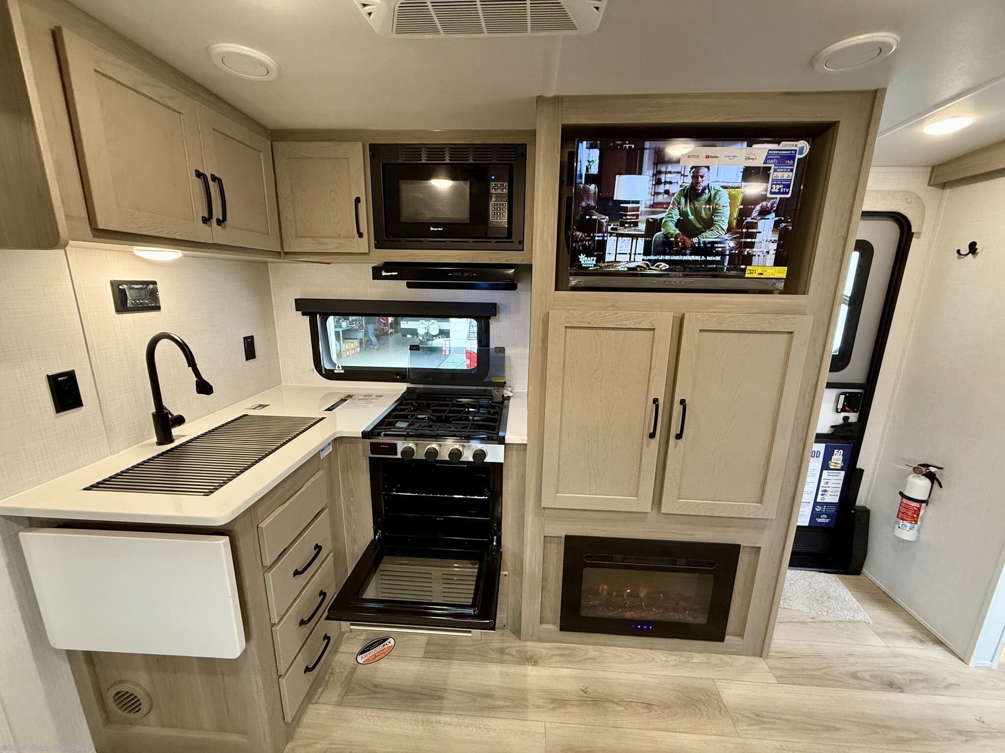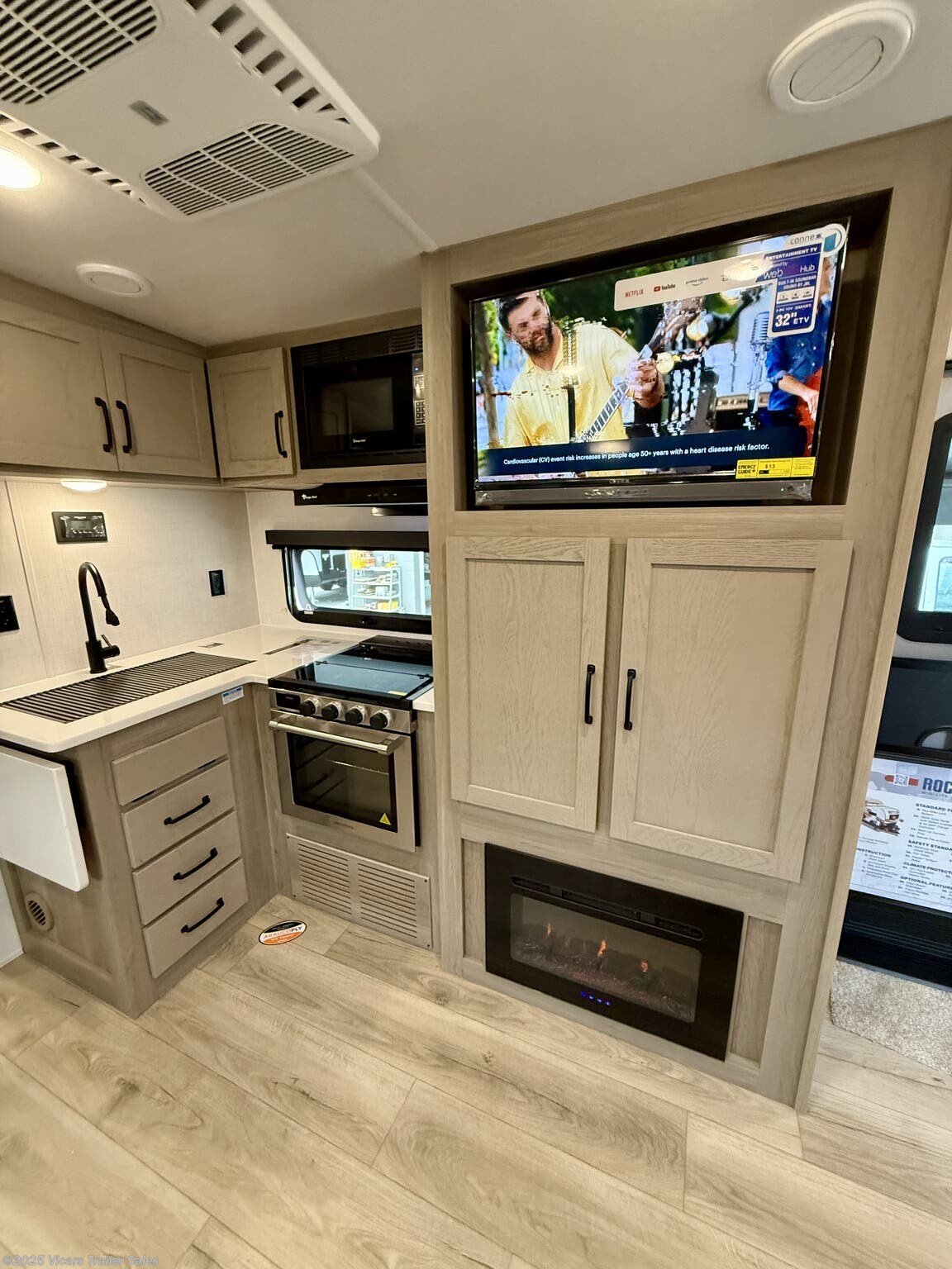 This travel trailer boasts a comprehensive list of features aimed at maximizing comfort and convenience. It is equipped with a furnace, air conditioning (15000 BTU), microwave, oven, refrigerator, and stove with a stovetop burner, ensuring you can prepare meals comfortably whether in hot or cold weather. A water heater, exterior grill, and external shower add to its outdoor living capabilities. Inside, you'll find a cozy fireplace, queen-sized bed, and ergonomic rocker recliners for ultimate relaxation. Additionally, the RV includes modern entertainment options such as a surround sound system, TV, and TV antenna.