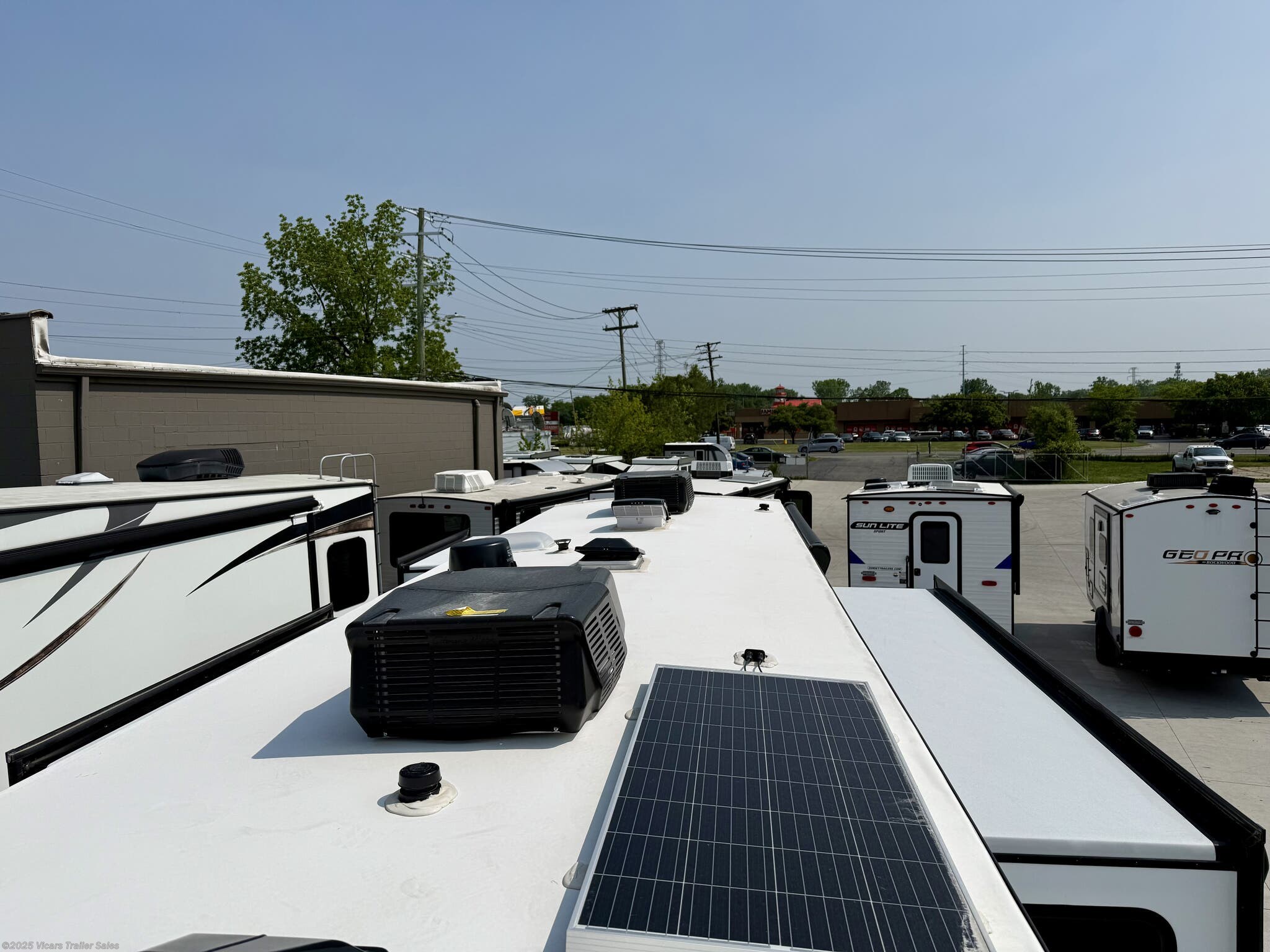 The exterior is designed for durability and convenience, including an awning, external shower, ladder, and leveling jacks. Security and safety are prioritized through detectors for smoke, LP, and CO, along with a fire extinguisher. The RV features a power roof vent and roof vents to ensure excellent ventilation.