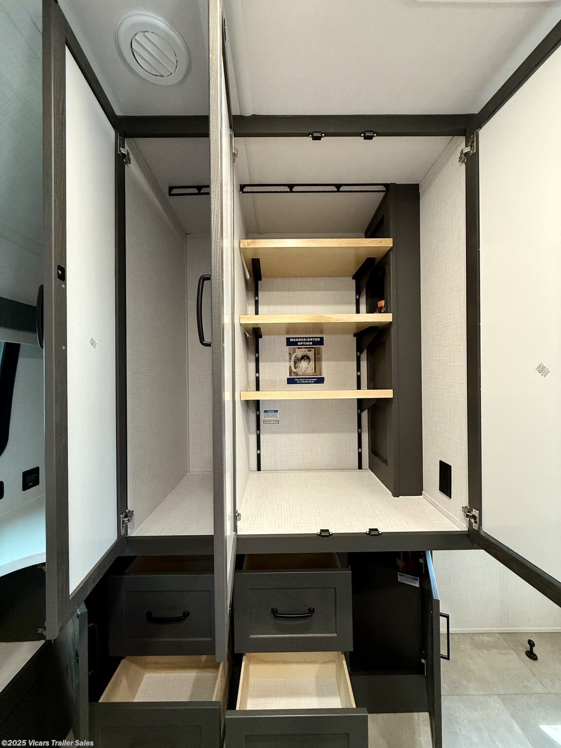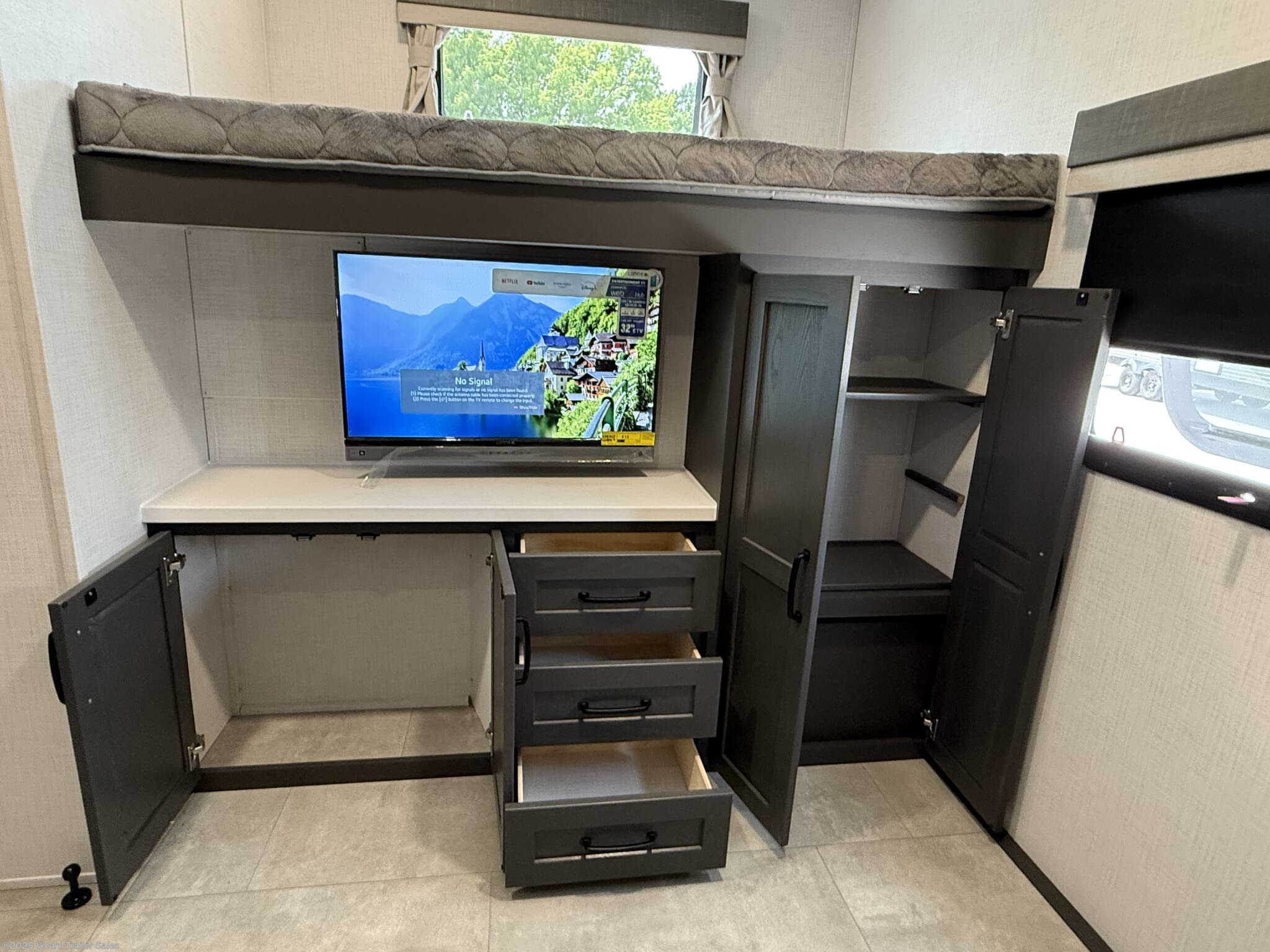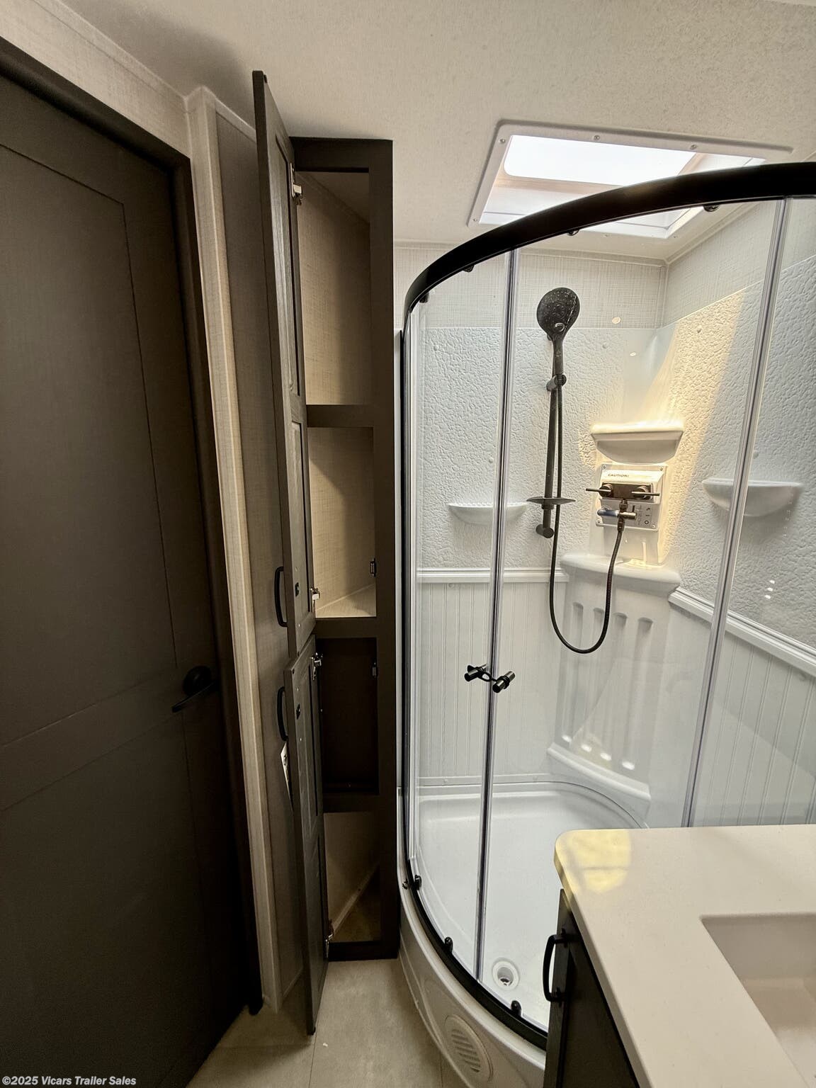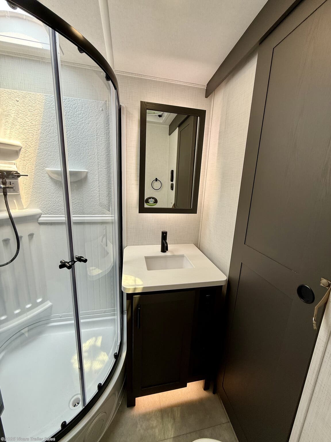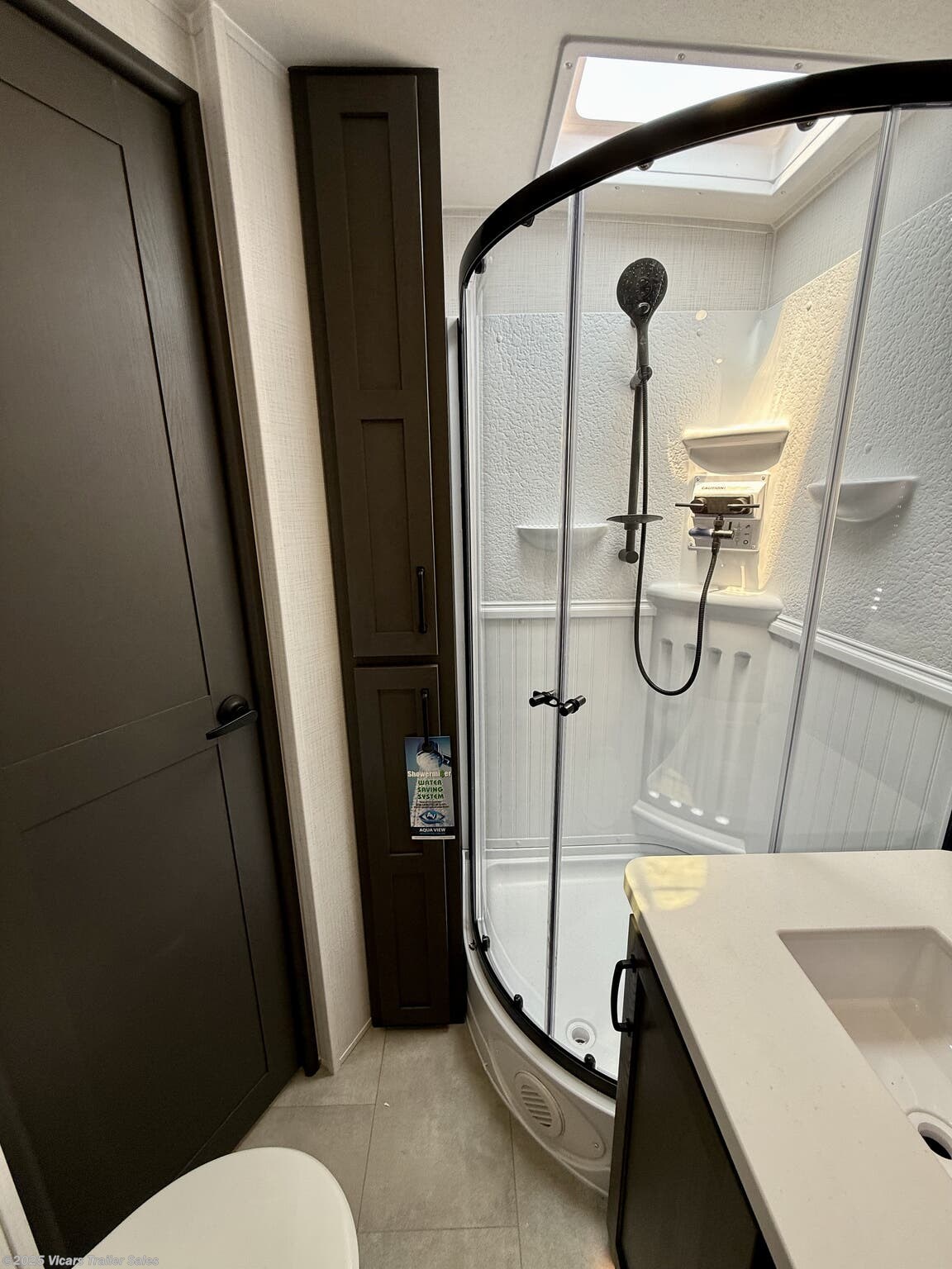 - Bathroom with shower, toilet, medicine cabinet, and ample water capacities (54-gallon fresh, 53-gallon black, 131-gallon grey)