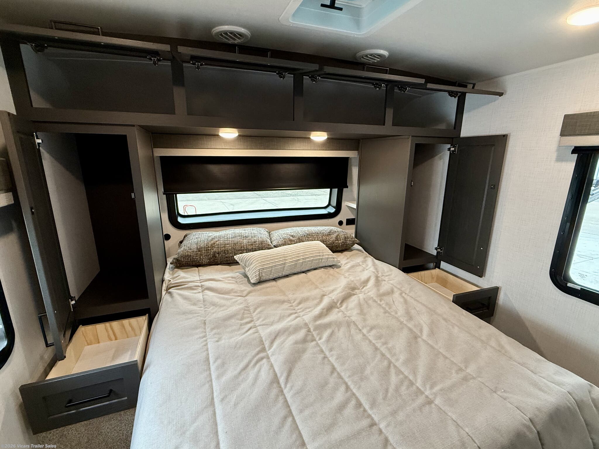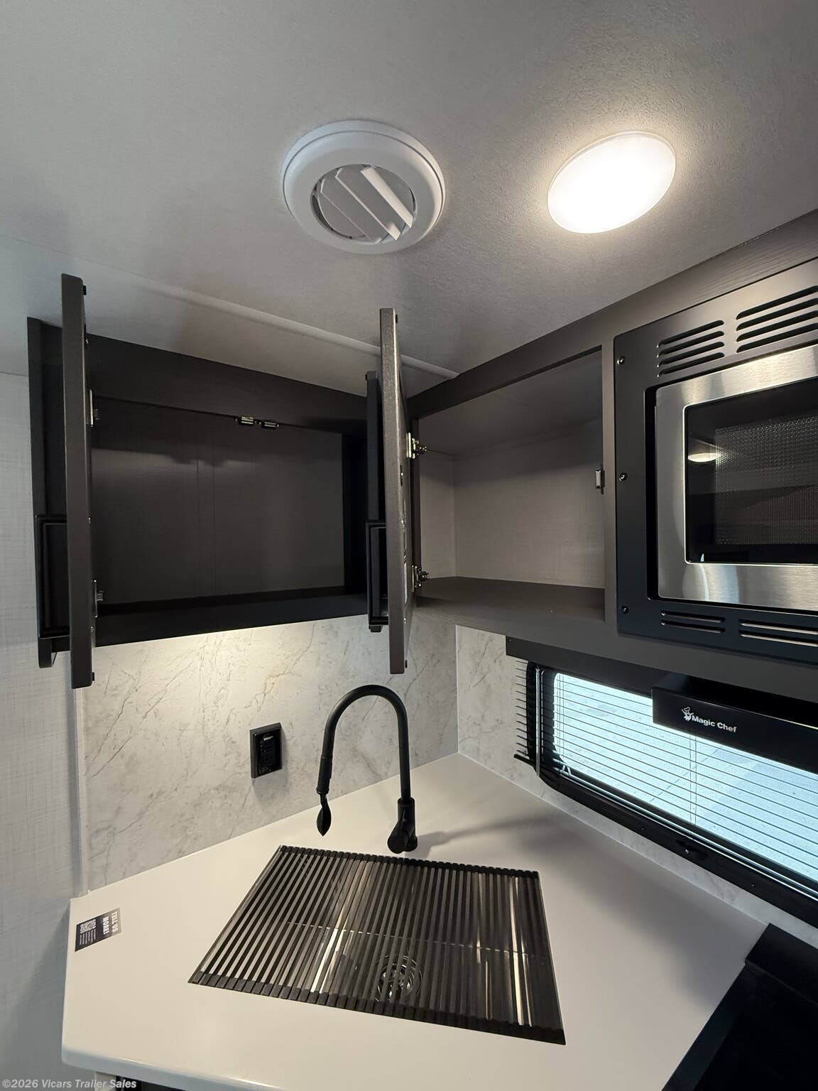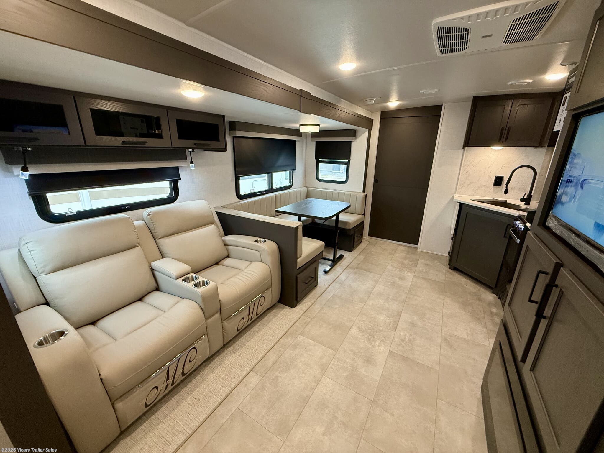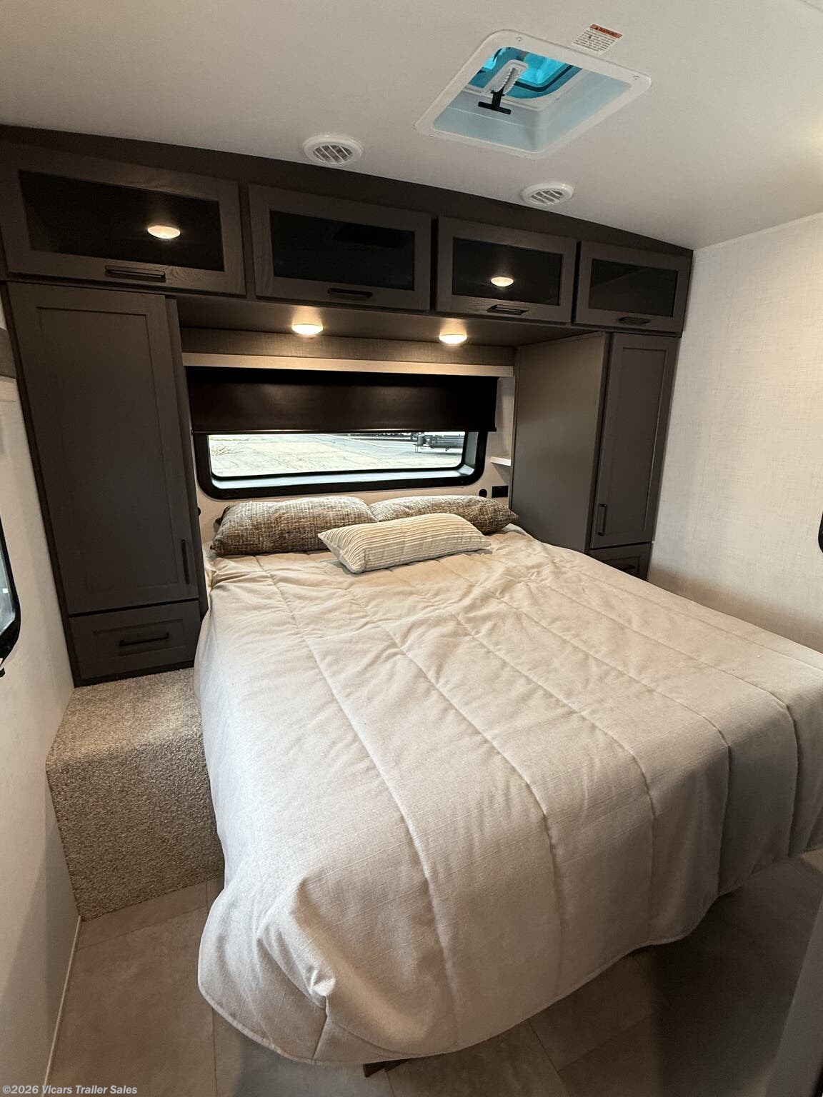 This modern travel trailer is equipped with a high-capacity 15,000 BTU air conditioner, ensuring comfort during hot days. For entertainment, it features a surround sound system, TV, and TV antenna – perfect for relaxing after a day of adventure. Skylights and roof vents bring in natural light and excellent airflow, creating a bright and airy interior atmosphere.