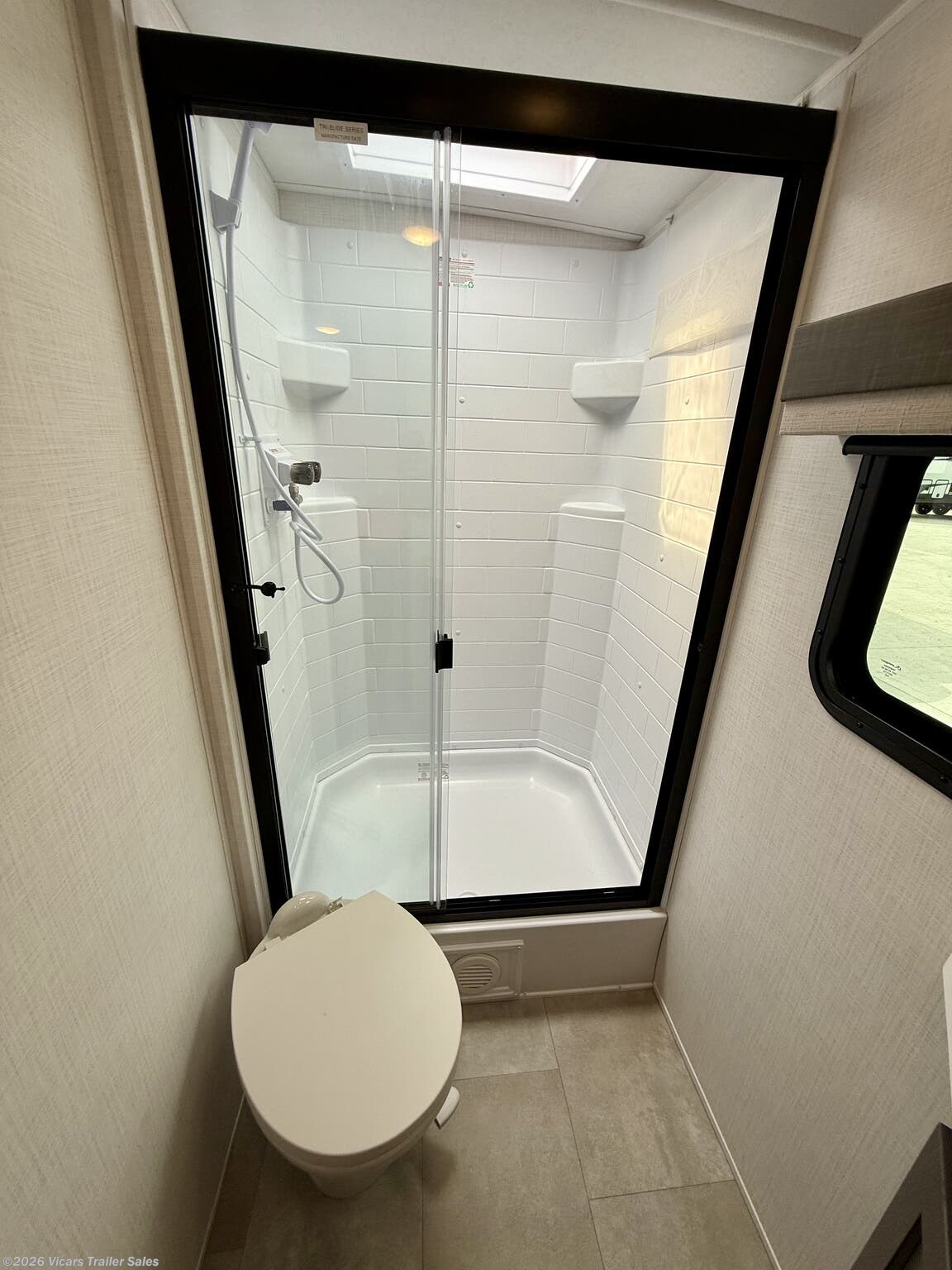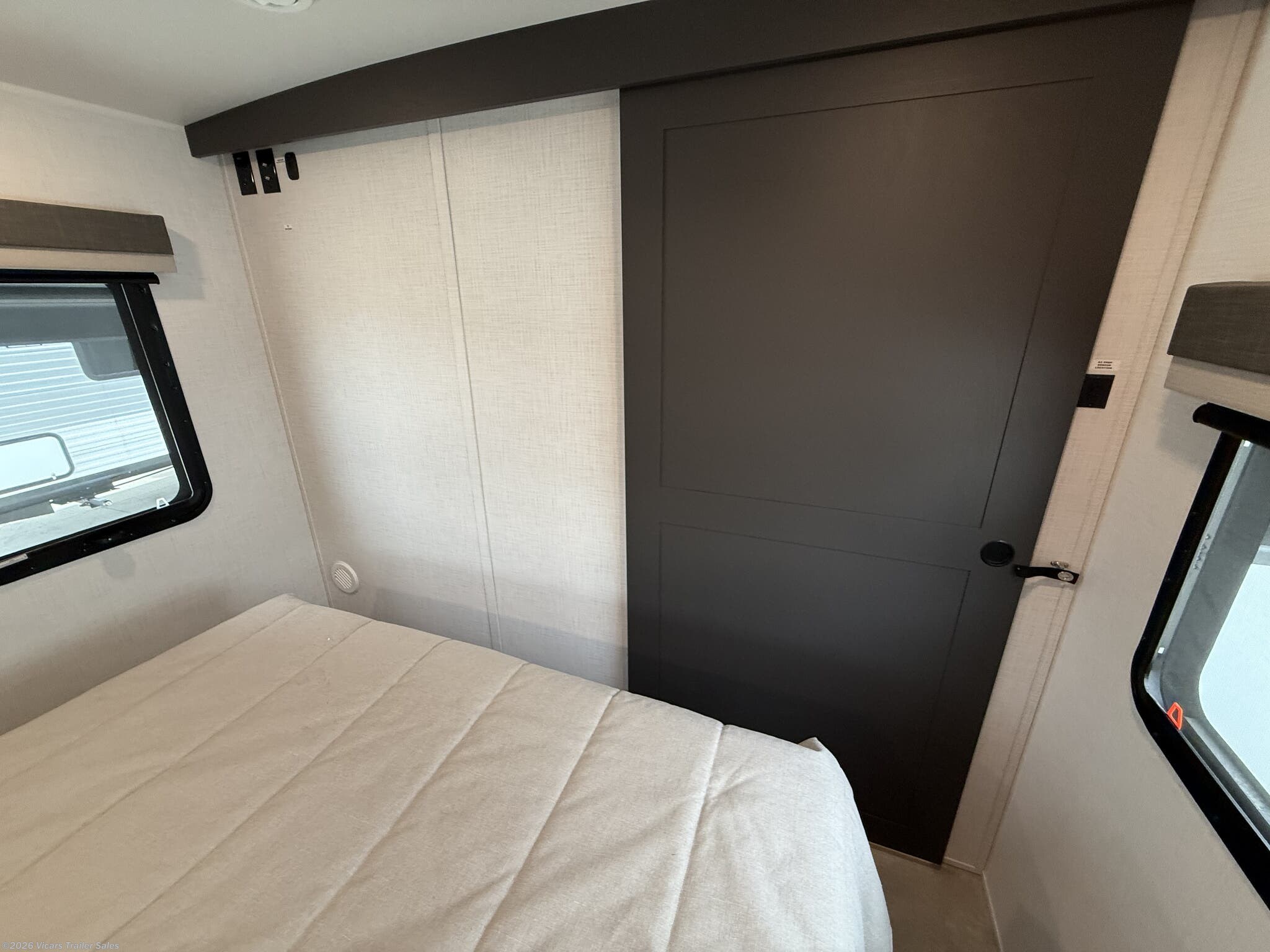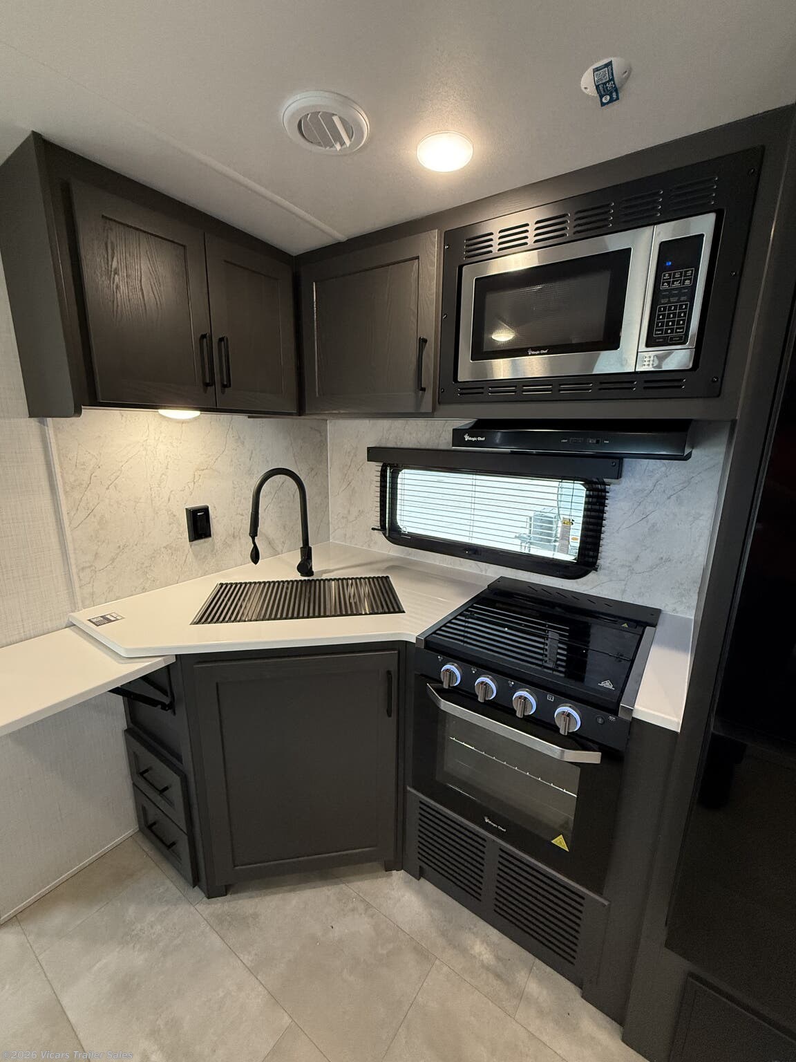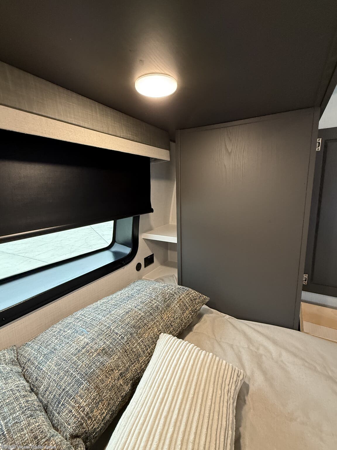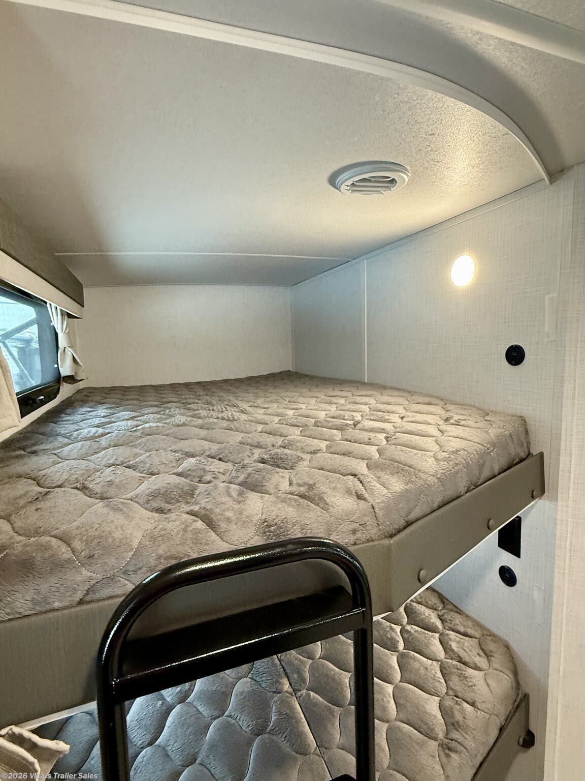 This modern travel trailer is equipped with a high-capacity 15,000 BTU air conditioner, ensuring comfort during hot days. For entertainment, it features a surround sound system, TV, and TV antenna – perfect for relaxing after a day of adventure. Skylights and roof vents bring in natural light and excellent airflow, creating a bright and airy interior atmosphere.