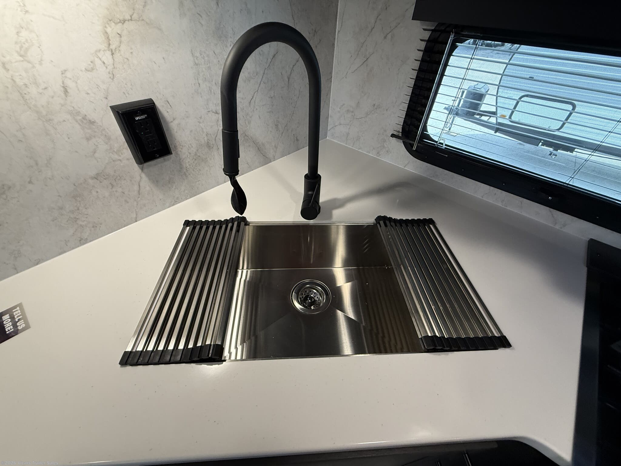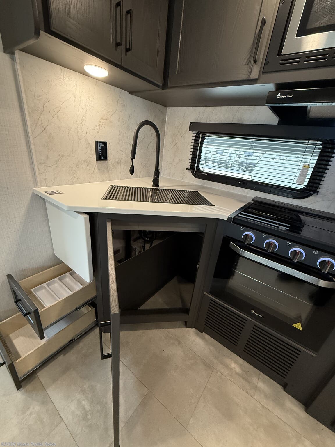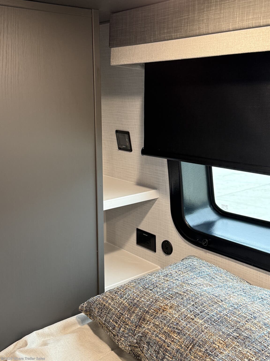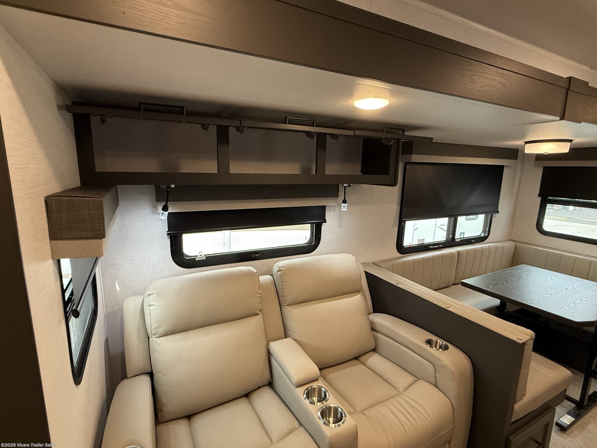 This modern travel trailer is equipped with a high-capacity 15,000 BTU air conditioner, ensuring comfort during hot days. For entertainment, it features a surround sound system, TV, and TV antenna – perfect for relaxing after a day of adventure. Skylights and roof vents bring in natural light and excellent airflow, creating a bright and airy interior atmosphere.