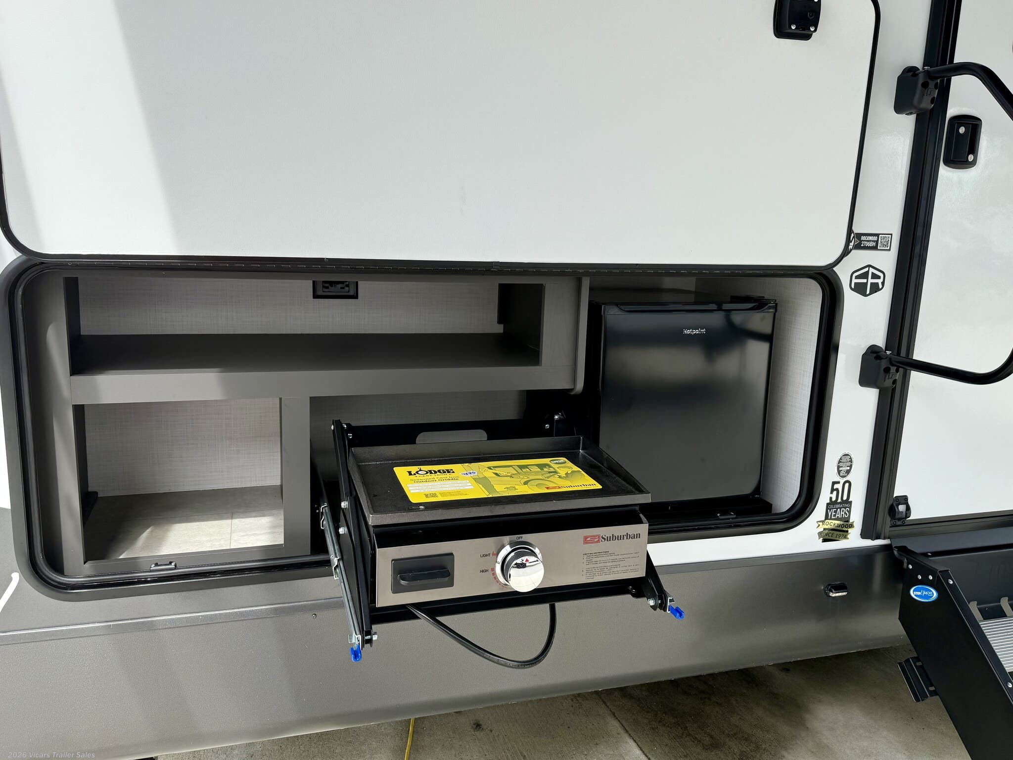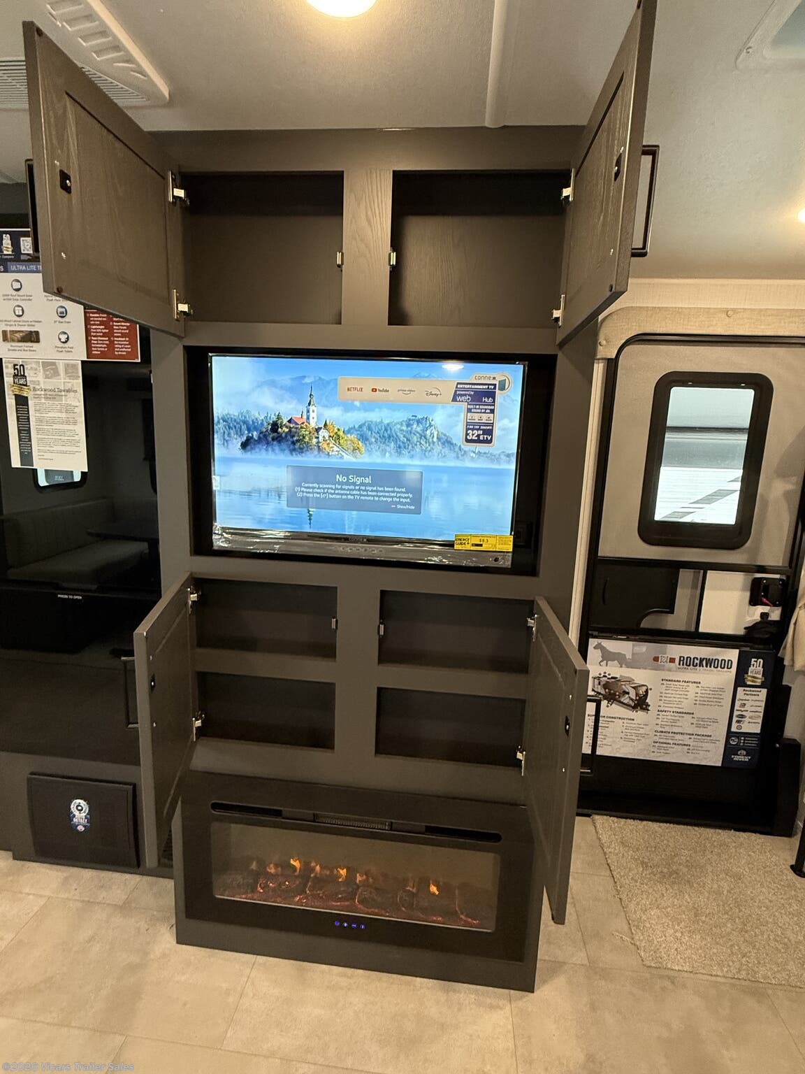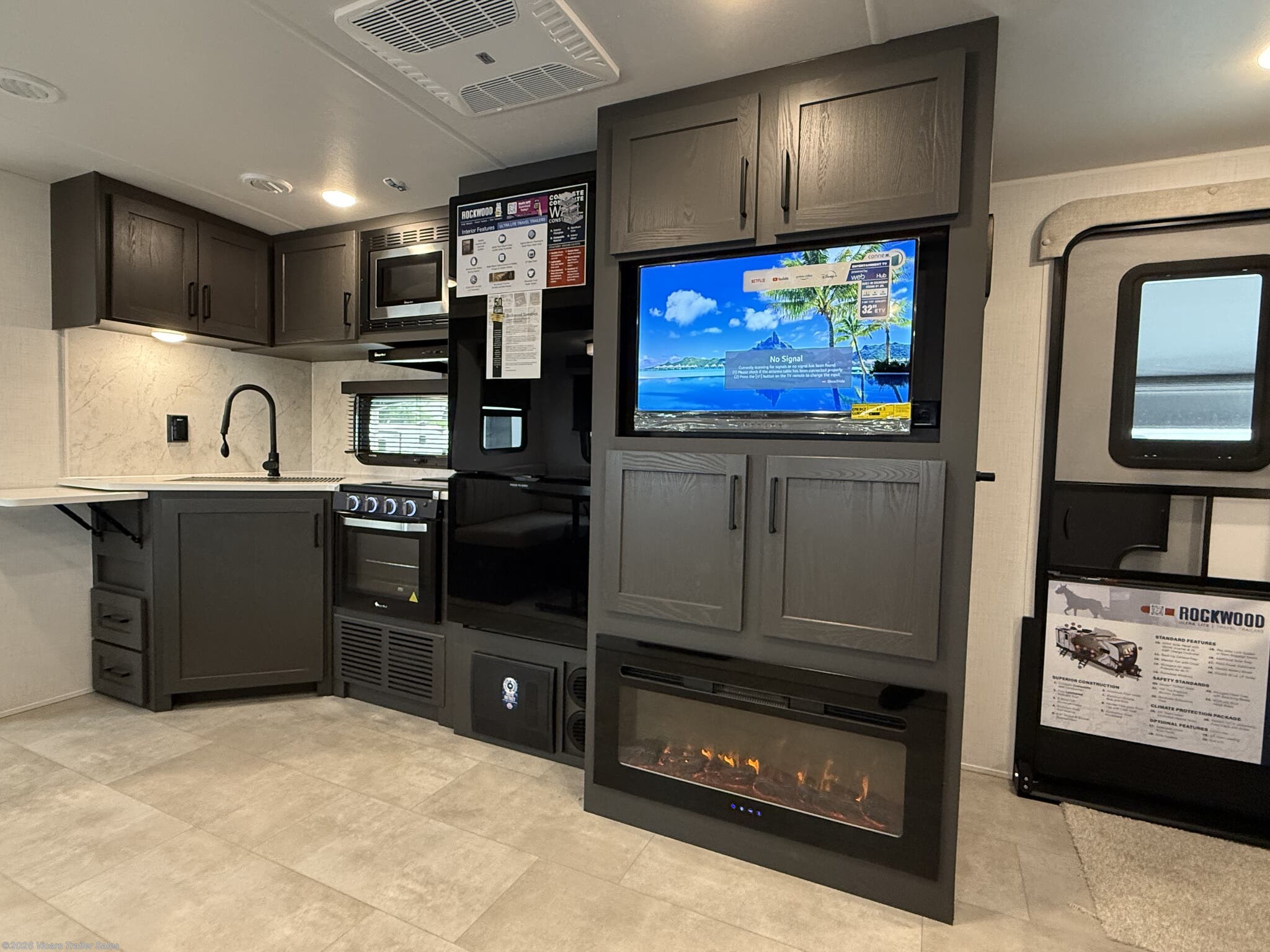 The Rockwood Ultra Lite prioritizes safety and convenience with features such as a fire extinguisher, CO and LP detectors, smoke detector, and an external shower for outdoor cleaning. Solar panels, a battery charger, inverter, and water heaters enhance off-grid capabilities, making this RV ideal for remote camping trips.
